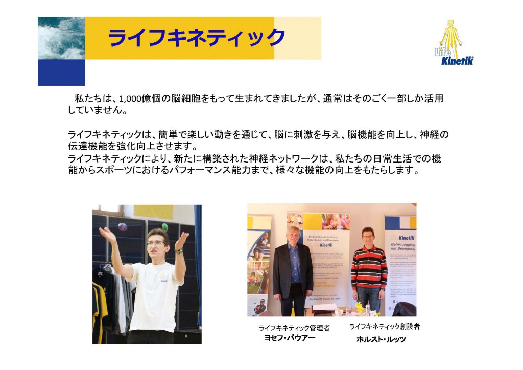 ライフキネティック(Life Kinetik)はドイツの運動指導者 ホルスト・ルッツ氏が独自に研究開発したメソッドで、4歳児以上であれば、年齢・体力レベルに関わらず、誰もが楽しくできるのが特徴です。